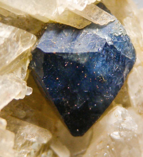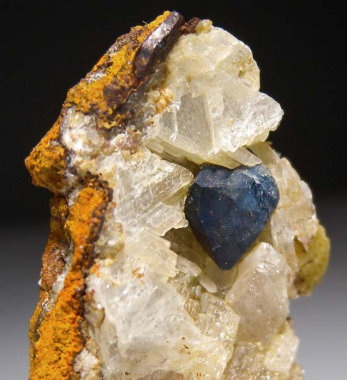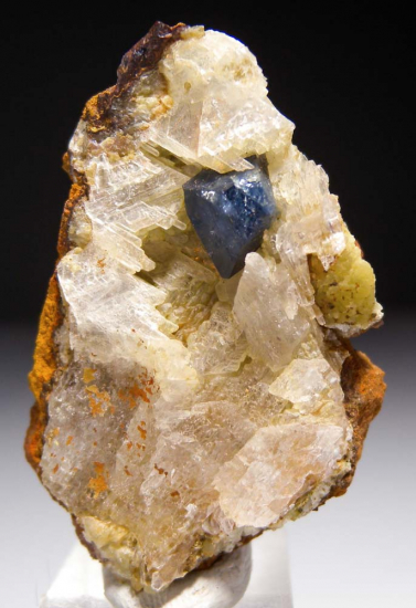 Lustrous blue Scorodite crystal on white Selenite from Mapimi. The Scorodite crystal has good blue color and is 7mm in size. Scorodite is a high level mineral species. In Wayne Thompson's book 'Ikons', Thompson categorizes mineral species into 7 castes based on their hierarchy of status and value. Scorodite is listed as being in the first (highest) caste. Scorodite is rare as a fine mineral specimen, take the opportunity to get a nice one at auction. |