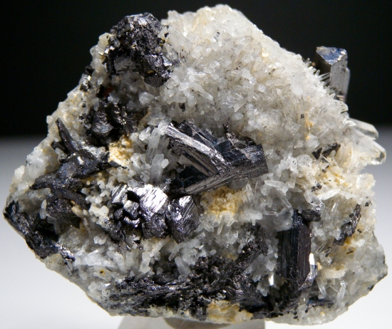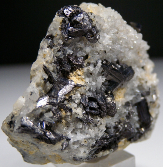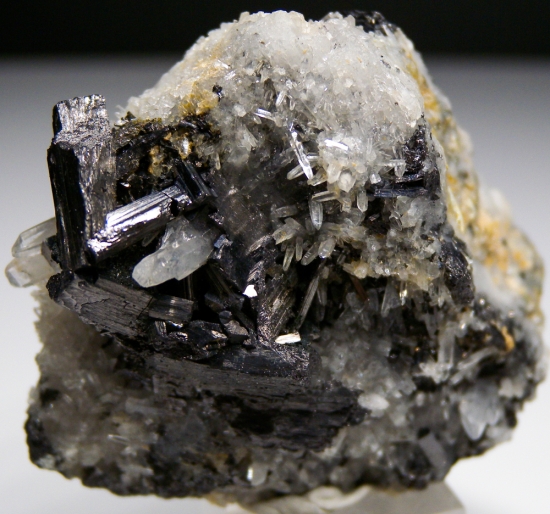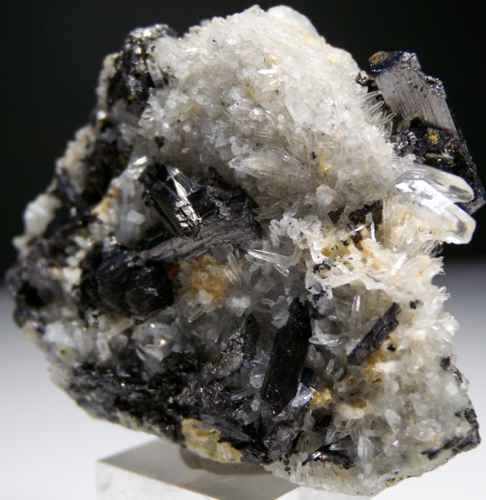 Black crystals of Enargite and tiny clear Quartz crystals on the front, top, and back of this historic specimen from one the western USA's last mining boomtowns. Not common elsewhere, Enargite was one of the major ores of Copper at Butte. This one has great crystals on both sides, hard to decide which is better! Valued at $250. |