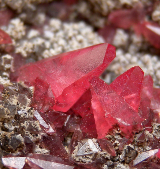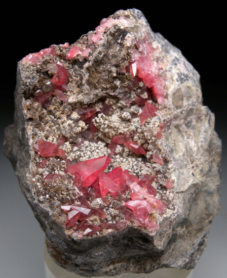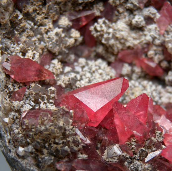 Transparent pink scalenohedral Rhodochrosite crystals in a vug lined by Quartz crystals. The largest Rhodo crystal is 1.1cm long. This was the best piece from a small parcel of specimens collected long ago and held back by a Pervian dealer. Valed at $500. |